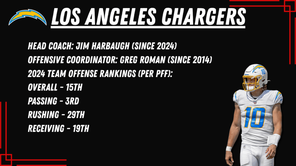 Herbert feels like an afterthought heading into 2025, currently slotted at QB13. He quietly posted eight top-12 finishes last season, showing he still offers a solid weekly floor. With a more balanced, run-heavy offense under Jim Harbaugh, Herbert may lack the ceiling he once had, but he remains a dependable low-end QB1 you can draft late in drafts.