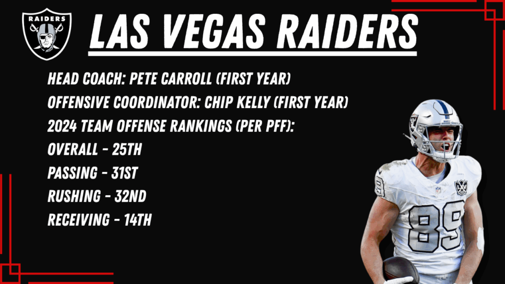 Brock Bowers broke records as a rookie, posting 112 receptions and 1,194 yards — the most ever by a rookie tight end. At a position that’s usually a weekly crapshoot, he stands out as a reliable target. Even in a less-than-ideal offense, Bowers is a target hog and should once again lead the team in targets. Having him locked into your starting tight end spot gives you a clear weekly advantage.
