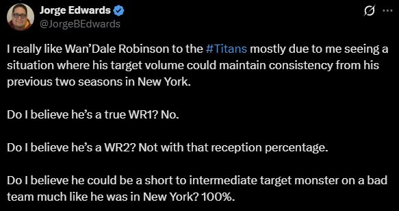 Free Agency Update: Wan’Dale Robinson has signed with the Tennessee Titans for 4 years and $78 million, reuniting him with his former head coach and now offensive coordinator Brian Daboll. As I mentioned earlier, this is a perfect spot for him to maintain his target volume from his past two seasons in New York, where he posted 140 targets each season.