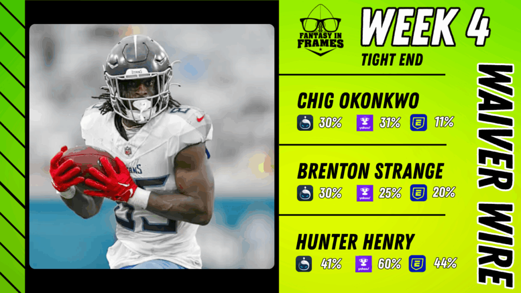 Rookie QBs love their tight ends because they are a nice, reliable safety blanket for them as they adjust to the NFL. Chig Okonkwo gets a lot of those dumpoffs from Cam Ward at or near the line of scrimmage (7.3 aDOT in week 3), so he provides a nice level of receptions upside weekly. Plus, with Calvin Ridley being a massive disappointment so far this year, Ward’s going to have to rely on Okonkwo a ton this year.